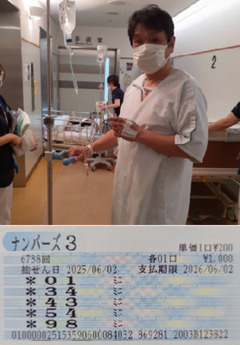 ![]() [「闘尿日記E」] 2025年6月11日 ![]() ご無沙汰のミニスペース「1」狙いでした。 〜〜〜〜〜〜〜〜〜〜〜〜〜〜〜〜〜〜〜〜〜〜〜〜〜 4月12日(土) 昨日はミニとN4ボックスが当たり一昨日のミニ当せんに続き2連ちゃんだ。ラッキー! ケータイのコラムと情報メールを送り、明日から入院するので、ナンバーズを一週間分買いに行き、 図書館によって本屋大賞3位の「小説」野崎まど(著)を借りた。 明日の入院の準備をしてると、なんだか旅行に行くみたいで楽しい気分になる。 しかし、手術で目覚めなかったらどうしょう? まだ年金ももらってないのになんてネガティブな考えも頭によぎる。 4月13日(日) 朝6時からウォーキングで1万歩クリアーして、仕事へ。 午前中、自分のお客さんを3人カット。 お昼を食べ1時に店を出て○○病院へ。 日曜日で入り口は閉まっているので、時間外出入口より中に入る。 熱を測り、同意書などいろいろな書類を提出して、コロナ?のアンケート用紙など記入後、 重たい荷物をかかえ5階の東病棟へ向かった。 部屋は4人部屋の515号室。70〜80代のお年寄りが3人。 右腕に名前が入ったリストバンドを付け、15時にシャワーを浴びて寝巻に着替えた。 18時に晩御飯、量が少ないので、物足りないなぁ。 あぁ〜、ビールが飲みたい。痩せるだろうな。 21時に消灯。 4月14日(月) 昨夜は、まくらも変わり、3人のいびきの合唱でなかなか眠れなかった。 6時に起床、8時に朝食だが自分だけ運ばれない。 手術着に着替え、血栓予防の靴下をはき、浣腸をしてトイレに行き、左手甲の血管から点滴を入れる。 13時20分に手術予定だったが、早まるみたいと言われ、妻にラインを入れ12時に病院に来てもらった。 しかし、早まるどころか1時間くらい手術が遅れ、ティルームで待機。 看護師に案内され手術室へと向かう。 妻に写真を撮ってもらい、見送られながら14時半に手術室に入った。 名前の確認をする。全身麻酔の同意書にサインをし、手術台のベッドに横たわる。 酸素マスクみたいなのをかぶせられて、点滴をされるとそのあとどうするのか?と思ってる間に意識がなくなり眠ってしまった。 名前を呼ばれ目覚めたら病室のベッドの上だった。 意識がぼんやりしてまったく記憶がない。 妻からのラインを見ると17時34分に「お疲れ様、病室まで行かれんから帰るね」と入っていたので、手術に3時間くらいかかったのかな? 術後は痛みと我慢できないような強い尿意があり、座薬の痛み止めを入れてもらった。 4月15日(火) 左手甲の血管に4種類の点滴、鼻に酸素のチューブ、胸に心電計?おち〇こに尿道カテーテルが付いて身動きが取れなかったが、午前中に酸素チューブと心電計をはずして、看護師に身体を拭いてもらってから、手術着から寝巻に着替えた。 今は点滴が3種類とカテーテルに繋がれている。 会陰部が痛く座っているのがきついので、痛み止めのカロナールをもらってのんだ。 持ってきたパソコンにナンバーズのデータを入れ、ユーチューブやティーバーでドラマを観たり、小説を読んで時間を過ごした。 ――つづく。 〜〜〜〜〜〜〜〜〜〜〜〜〜〜〜〜〜〜〜〜〜〜〜〜 今回のおすすめN3は、第6742回終了現在、第6669回より 73回出現なしのボックスペア未出現 [58] 狙いで 10点。 [058] [158] [258] [358] [458] [558] [658] [758] [858] [958] 超速ロト・ナンバーズTOPへ(C)イマジカインフォス