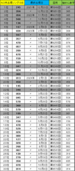 ![]() [「かくれんボックスシングル、#17」] 2025年9月17日 ![]() 〜〜〜〜〜〜〜〜〜〜〜〜〜〜〜〜〜〜〜〜〜〜〜〜〜 「かくれんボックス」とは、読んで字のごとく「かくれて見つからないボックス数字」のことだ。 上記の表は、9月12日(金)第6812回終了現在の長期未出現ナンバーズ3シングルボックス数字。 コラムバックナンバー「かくれんボックスシングル#16」5月23日第6732回時点の表から出現した数字をグレーで網かけして、新たにボックス数字を追加して更新しました。 ※超速サイトコラムでは、表が見にくいと思いますので、超的中法WEBサイトのわたしのコラムで見てくださいね。 バックナンバーを確認していただければわかると思いますが、3ヵ月半更新しないあいだに、たくさん見つかりました。 1位「245」 2位「356」 3位「056」 4位「568」 5位「136」 6位「167」 8位「567」 16位「047」 18位「069」 20位「458」 22位「348」 26位「369」 28位「189」 と13個出現。 現在のワースト1位は「039」で2023年2月12日より2年7ヵ月出現していません。 回号で言えば第6812回終了現在、第6145回「309」より667回出現なし。 2位「357」は、6月22日より出現なしで、回号では第6238回「357」より574回出現なし。 3位「479」4位「057」5位「289」も2年以上出現なし。 第6812回終了現在、百の位「9」が、第6745回より67回出ていないので、 表から「9」を探して百の位にあてはめ「903」「947」「928」「951」「985」「950」「957」「952」「908」「913」「927」「907」が期待大。 シングルボックスペア数字ワースト1位「15」は、第6724回より88回出ていないので、 「15」ぺアを探して「159」「145」「156」が期待大。 2位「59」は、第6751回より61回出ていないので、 「159」「589」「059」「579」「529」が期待大。 3位「35」は、第6752回より60回出ていないので、 「357」「358」が期待大。 ストレートペア数字ワースト1位は、第6285回より527回出現なしの「07※」なので、 「075」「076」「079」が期待大。 2位は、第6336回より476回出現なしの「59※」なので、 「591」「590」「597」「592」が期待大。 3位は、第6362回より450回出現なしの「1※4」なので、 「154」「104」が期待大。 大穴数字が好きな人は、狙ってみてはいかがでしょうか? また、軸にしたい数字や出そうかなと思う数字があれば、かくれんボックス数字から選んでみてはいかが? ♪かくれんぼなんかしてないで もう出てあげるって 早く言って もう当てたい その言葉が宙に舞う〜♪ 〜〜〜〜〜〜〜〜〜〜〜〜〜〜〜〜〜〜〜〜〜〜〜〜〜 今回のおすすめN3は、第6812回終了現在、第6724回より88回出現なしの ボックスペア未出現[15]狙いで10点。 [051] [151] [251] [351] [451] [551] [651] [751] [851] [951] 超速ロト・ナンバーズTOPへ(C)イマジカインフォス