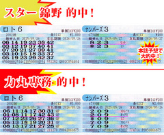![]() [55周年記念ライブでいい流れに‼] 2025年5月31日 ![]() 26日(月)、まずはロト6で僕が5等1口を自力でゲット! 小当たりからコツコツと、ですよ‼ 対する専務もQPで5等1口ゲット! こちらは1シートに1等当せん数字がすべて入っているという状況。これでは「何だかなー」と専務。その何だかなーを吹き飛ばしたのは、続くナンバーズ3。当せん数字「902」を「209」グランドスラム狙いでボックス当せん! しかも勝負の2口‼ さすがです‼ さらにナンバーズ4でも当せん数字「9115」を今週29日発売の本誌7月号予想「5914」でひとつ違い! 惜しすぎます‼ 27日(火)は僕の出番‼ ナンバーズ3で当せん数字「238」を本誌予想「823」でセットボックス大当たり‼ 55周年ライブを明後日に控えての、前祝い⁉ 本誌的中は本当にうれしいです! これはいい流れですよー‼ 28日(水)は専務! ナンバーズ4で当せん数字「7357」を「6747」で買っていた専務。「77」ダブルは見事に的中したものの…惜しい結果に! ちなみにこの日の抽せん回号は「第6735回」。これ、大ヒントでしたねー‼ 29日(木)は、55周年記念ライブ当日! これまで応援してくださったファンの皆さん、関係者のみなさんから、たくさんの「愛」をいただいて55周年を迎えることができました。本当にありがとうございました! みんなー「愛してる」よー☆ そしてナンバーズ4では専務は当せん数字「6779」を「7596」でまたまた惜しいひとつ違いっ‼ 30日(金)は、ナンバーズ3当せん数字「549」を「154」「654」グランドスラムで狙ってた専務! 実はこの日の占いでしし座は最下位! 結果、占いどおりに⁉ 今回はここまでで2人合わせて、757週連続当せん。オススメ数字は、絶賛開催中のゴルフ全米女子オープン、初日に4アンダーでトップに立った竹田麗央選手の誕生日「4」月「2」日を。ちなみに僕が出演するテレビ東京『アップグレードゴルフ』に6月1日、8日と出ているので、ぜひ見てくださいね〜♪ 超速ロト・ナンバーズTOPへ(C)イマジカインフォス