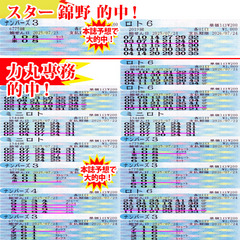 ![]() [錦野さん&力丸専務、本誌予想が大爆発!] 2025年7月26日 ![]() 21日(月祝)、まず魅せたのは専務! ロト6で4等1口に5等2口! すべてQPでの当たり! さすがの引きですね〜! すると、この当たりがいい流れを作ります。続くナンバーズ3では当せん数字「224」を「244」グランドスラム狙いで、思わず「ギャーー!」と叫ぶ専務。さらにナンバーズ4でも当せん数字「7780」を「8067」「8017」で買っていて、惜しいひとつ違い! 当たりが近そうです! 22日(火)は、またも専務! ミニロトで「02」「24」を軸にしたところ、これがドンピシャ! 4等3口と絶好調! 23日(水)は、僕の出番! なんと今月2回目となる本誌予想「108」が大的中! 当せん数字は「801」でしたが、ツイてますねー! これでセットボックスゲットです! 対する専務はもっとすごかった! まずは、ナンバーズ3で本誌予想「401」でミニゲット! これも本誌2回目! さらに本線で「108」グランドスラムを2口勝負で、ボックス×2口ゲット! さらにさらに先週金曜日に逃した「601」がどうしても気になってグランドスラムで購入したところ、さらにミニゲット! 当たりはまだまだ続きます‼ 続くナンバーズ4で当せん数字「5493」を「9534」ボックス、「9534」「4539」「5394」をセットボックスで当せん! もう誕生月で大爆発の専務! 24日(木)は、「天しゃ日」「一粒万倍日」「大安」の吉日三重奏! すると、ロト6で僕が5等1口を自力でゲット! 対する専務も5等1口をQPで軽やかに当ててきます。そして、続くナンバーズ3では当せん数字「671」を「761」グランドスラム狙いでボックス、「716」グランドスラム狙い(ボックスの代わりにセット)で、セットボックスを大当たりの専務‼ もう当たりが止まりませんっ‼ 迎えた25日(金)は、専務が魅せました! ナンバーズ3当せん数字「294」を「391」グランドスラム狙い‼ 一瞬、違うように見えますが、風車盤で百の位「3」の隣「2」、一の位「1」の隣「4」なんですー! 惜しかったーっ‼ 今回はここまでで2人合わせて、767週連続当せん。オススメ数字は、ちょっと景気のいい数字を。今週の日経平均が「4」万「2000」円を超える高値に。このまま好景気に、なんていうのは難しいですが、維持してほしいですね〜! 超速ロト・ナンバーズTOPへ(C)イマジカインフォス
