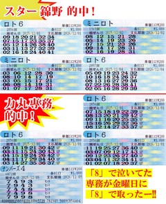 ![]() [誕生月突入でさっそくロト6で‼] 2025年12月6日 ![]() 12月1日(月)、まずはロト6で僕が5等1口、対する専務はQPで5等3口ゲット! 月が変わって、いよいよ僕の誕生日も近づいてきましたよ! そんななかでの快調なスタートです! 続くナンバーズ3では、専務は当せん数字「886」を「680」グランドスラム狙い! さらに本誌予想も「887」と「866」‼ これどうなってるのーっ‼ 若干お冠の専務! 2日(火)は、ミニロトで僕が4等2口を自力でゲット! この日の1等は久々に4000万円弱と高配当でした♪ ナンバーズ3では、専務が魅せます! 当せん数字「584」を「745」グランドスラム狙い‼ 風車盤、百の位「7」の隣は「8」なんですよー! 昨日に続き「8」にやられてます…。 3日(水)は、またも専務! ナンバーズ3当せん数字「156」を「197」グランドスラム狙い! 一見、1数字しか合ってないように見えますが、そうなんです! でもこの百の位をしっかり当てた、ということが大事! ナンバーズ4では僕が魅せますよー! 当せん数字「7263」を「7063」で買ってた! しかも風車盤の矢が落ちてのこのストレートひとつ違いーっ‼ 買っていたのはボックスだったけど、悔しいーっ‼ 4日(木)は、ロト6で僕が4等ゲットーッ‼ やっぱり誕生月に入って運気も上昇中! 次回は3等かな?? ちなみにナンバーズ4の当せん数字は「5571」。僕の55周年、そして『空に太陽がある限り』が1971年。そう「55」と「71」で買えましたよねーっ! まあ結果論ですけど♪ 5日(金)は、専務がやってくれました! ナンバーズ4で当せん数字「4784」を「7448」でセットボックスゲット! 実は専務、ナンバーズ3が終わった段階で「今週はこんな週だったー」と言いかけたんですが、いや今日のナンバーズ4は自信がある! と言ったんです。専務曰く、「今日は24(にしきの)が来る!」と。結果、今週泣かされていた「8」も入り、「24」の裏で「74」との組み合わせで見事「7448」が出て来たというわけ! この当たり、すごいですよ、ほんと! 当てた専務、「スッキリしたー!」だって(笑)。今年も残り少なくなってきましたが、まだまだ当たりがありそうですよー! 僕も負けないぞーっ‼ 今回はここまでで2人合わせて、786週連続当せん。オススメ数字は、12月にある「一粒万倍日」。一粒の籾が万倍にも実る、といわれる縁起のいい日。宝くじ購入にはもってこいなんです。「8」「9」「20」「21」の4日! ぜひ宝くじ購入に加え、オススメ数字として活用してみてください♪ 超速ロト・ナンバーズTOPへ(C)イマジカインフォス