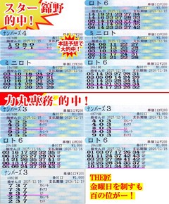![]() [誕生日翌日に本誌予想でN4ゲット‼] 2025年12月20日 ![]() 15日(月)、まずはロト6で僕が5等1口を自力でゲット! 続くナンバーズ3で魅せたのは専務! 当せん数字「355」を「455」グランドスラム狙いでミニゲット! 最高の週明けスタートですねー! でも、僕も負けてないんです! なんとナンバーズ4で当せん数字「7221」を僕の本誌予想「2271」が的中! 本誌的中は本当にうれしいですよーっ‼ ちなみに買っていたのはセットだったので、セットボックスゲット! 昨日が僕の誕生日ですから、やはり運気も上々! 対する専務も、「9272」を買っていて、どちらが当たってもおかしくない状況でした!! 16日(火)は、昨日の勢いそのままに僕がミニロトで4等2口を自力でゲット! やるときは、やりますよー! 続くナンバーズ3では専務が当せん数字「003」を「903」グランドスラム狙いでミニゲット! 昨日に続き、またも百の位でグランドスラムを逃す結果に。 飛んで18日(木)は、ロト6で僕が5等1口を自力でゲット! もうひと声ほしいところですーっ! 対する専務は5等2口をQPで軽やかに引いてきます! さらにナンバーズ4でも当せん数字「5879」を「2597」「2897」で狙っていて惜しいひとつ違いに! 当たりの匂いがプンプンします! 迎えた19日(金)は、やはりTHE匠こと力丸専務が締めてくれました! ナンバーズ3当せん数字「837」を「737」グランドスラム狙いでミニゲット! しかし、またも百の位でグランドスラムを逃す結果に! こういうときもあるんですね〜! 今回はここまでで2人合わせて、788週連続当せん。オススメ数字は、いよいよ発売終了が迫って来た「年末ジャンボ宝くじ」から。1等・前後賞合わせて「10」億円、さらに2等も「1」億円。気になる発売最終日は「23」日ですよー! みなさん、お買い漏れのなきように☆ 超速ロト・ナンバーズTOPへ(C)イマジカインフォス