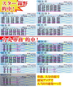 ![]() [僕のQPもなかなかの引きのよさ‼] 2025年8月23日 ![]() 18日(月)、まずはロト6で僕が5等1口を自力でゲット! これで、いい流れを作りたいですね♪ 対する専務は、5等3口をQPでゲット‼ 1シートに1等6数字がすべて入っているものもあり、引きのよさが光ります。すると、この引きのよさが次なる当たりを! ナンバーズ3で当せん数字「776」を「876」グランドスラム狙いでミニゲット‼ さすがです! ナンバーズ4では「9959」のトリプルが出現するも「1811」「6866」狙いの専務! 読み抜群です‼ 19日(火)は、大分へ出張! 僕の故郷でもあり、僕が初めてナンバーズ4セットストレートを買って当てたのは大分! 今回は専務も同行。すると、ミニロトで僕が4等2口ゲット! いい感じですよ! すると専務は、ナンバーズ3当せん数字「631」を「316」グランドスラムでボックス、「361」もグランドスラム狙いですがボックスの代わりにセットでセットボックスをゲット‼ しかもともに2口買いっ‼ 大分でいい運気とともに当たりもゲットー! ナンバーズ4でも当せん数字「9288」を「5898」狙いで惜しいひとつ違い! 飛んで21日(木)は、ロト6で僕が5等3口をQPでゲット! 久々のQPでしたが、いい引きですよ! ちなみに1シートで1等6数字がありました‼ これはいい流れ♪ 対する専務はナンバーズ3で当せん数字「741」を「814」グランドスラム狙いで惜しいひとつ違い! 続くナンバーズ4でも当せん数字「5806」を「0580」「0085」「0585」狙いで、こちらもひとつ違い! すると専務、ごみ箱から昨日買った券を拾ってきます。そう、昨日の専務の買い目は「6805」‼ 昨日なら当たってましたー! 昨日買った数字もしっかり覚えている! こういうところがTHE匠のすごいところ! 22日(金)は、専務が締めてくれます! ナンバーズ3当せん数字「461」を「261」グランドスラム狙いでミニゲット‼ しかも2口勝負‼ 風車盤で一の位の流れを読んで「1」には自信のあった専務! さすがです☆ 今回はここまでで2人合わせて、771週連続当せん。オススメ数字は、抽せん結果が出た「サマージャンボ宝くじ」から。1等は「19」組「173515」。この数字からチョイスしてみてはいかがでしょう♪ 超速ロト・ナンバーズTOPへ(C)イマジカインフォス