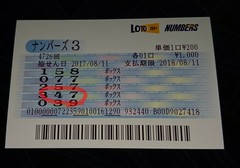 こんばんは、今日は休みだったので1ヶ月ぶりぐらいに購入したナンバーズ3が、ボックス当たりが来ました。久しぶりにゆっくりできて当たりも来ていい1日なりました。