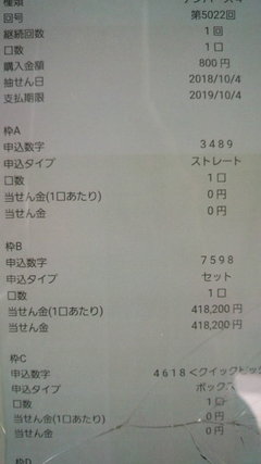 [3]ピーマルちゃん(20089741)/愛知県/39歳/男性 みなさんありがとうございます、運が良かったです大阪旅行で天満宮で福小判をかい福がきました(^^ゞ 諦めず、好きなら数字を信じて良かったです\(^o^)/ 2018-10-08 00:53:43