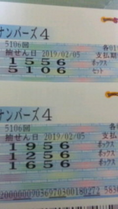 なお(20189771)/大阪府/64歳/女性 ![]() 5106の数字が気になり 自分の予想では 51〇6 だったんですが 自信がなかったので 5106 と 15〇6で数点購入してました 1596のボックスが当たっていました 予想通り 51〇6 のセットにしていたら SSでしたが… 当たっていたのでとても嬉しいです ![]() 2019-02-06 21:21:33