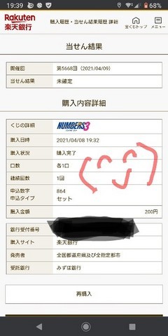 [3]T.T(20810677)/福岡県/44歳/男性 ひろぴんさん😁。 ナンバーズ3SBおめでとうございます🤗。 今日もあたりますように😁 2021-04-12 14:41:18
