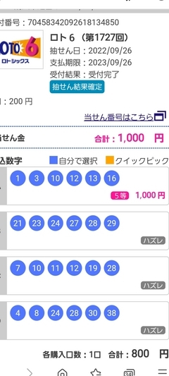 ◆ロト6なんとか5等当選\(^-^)/ ピーマルちゃん(20813514)/愛知県/43歳/男性 ![]() 久しぶりに5等当選しましたー(^-^) 2022-09-28 14:20:47
