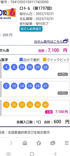 [5]ピーマルちゃん(20813514)/愛知県/43歳/男性 なおちゃん、ありがとうございますー\(^-^)/ Numbers3は、827をBOXにしてました(^_^ゞ このロト6は全く忘れてて嬉しかったです\(^-^)/ 2022-11-02 10:26:57