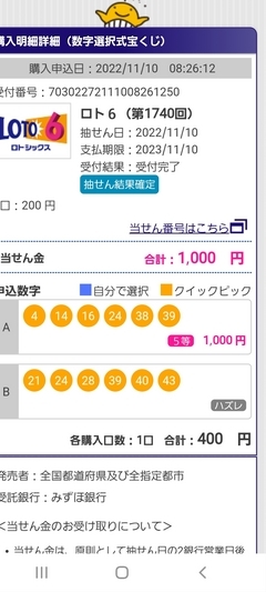 ◆ロト6 5等当たりちゃん\(^-^)/ ピーマルちゃん(20813514)/愛知県/43歳/男性 ![]() 2022-11-11 08:10:32